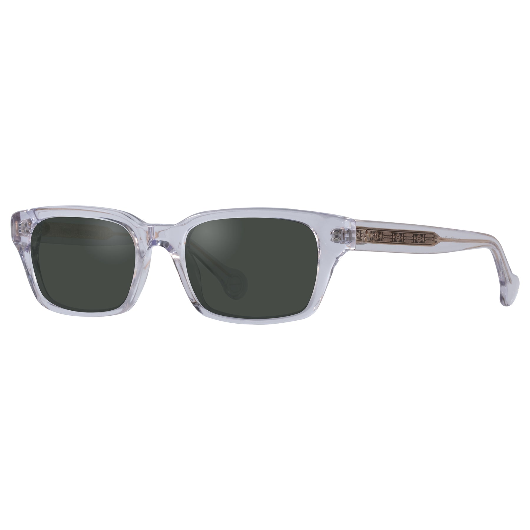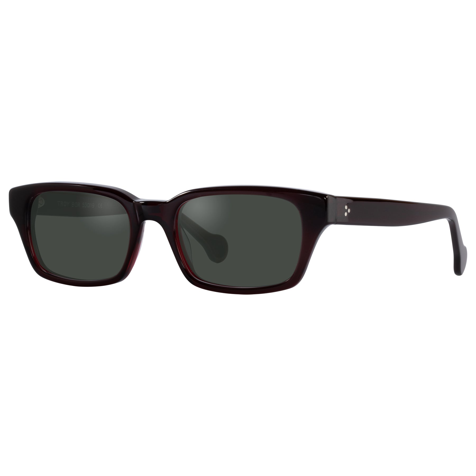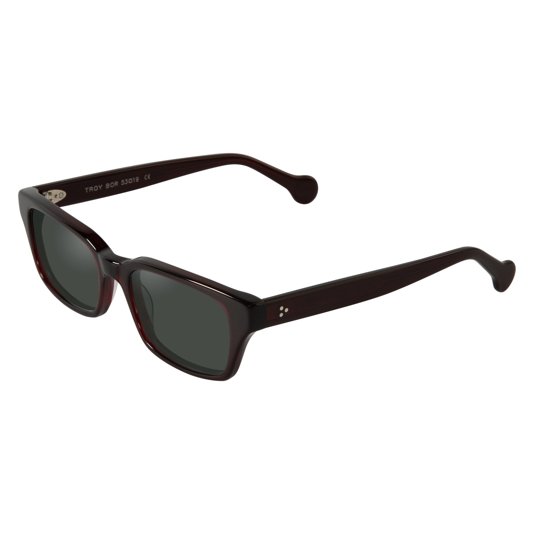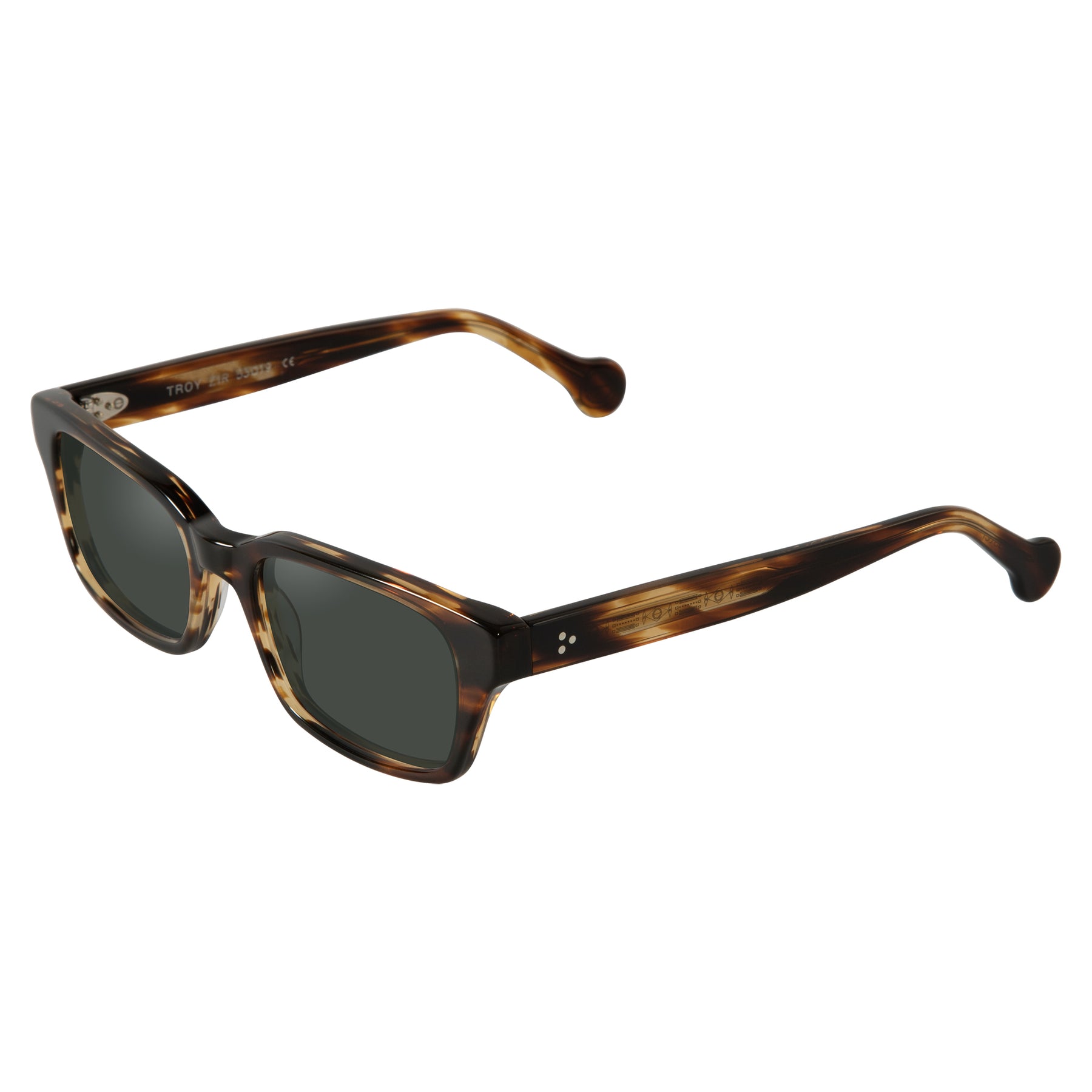 TROY polarized sunglasses cut 99.9% glare with backside AR for comfort. Available as plano sunwear or with integrated bifocal reader powers in premium acetate colors.